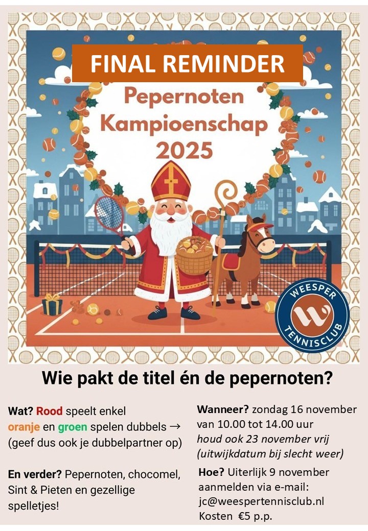 - als je wil meedoen met het Pepernotentoernooi, wel graag even een mailtje sturen met je aanmelding