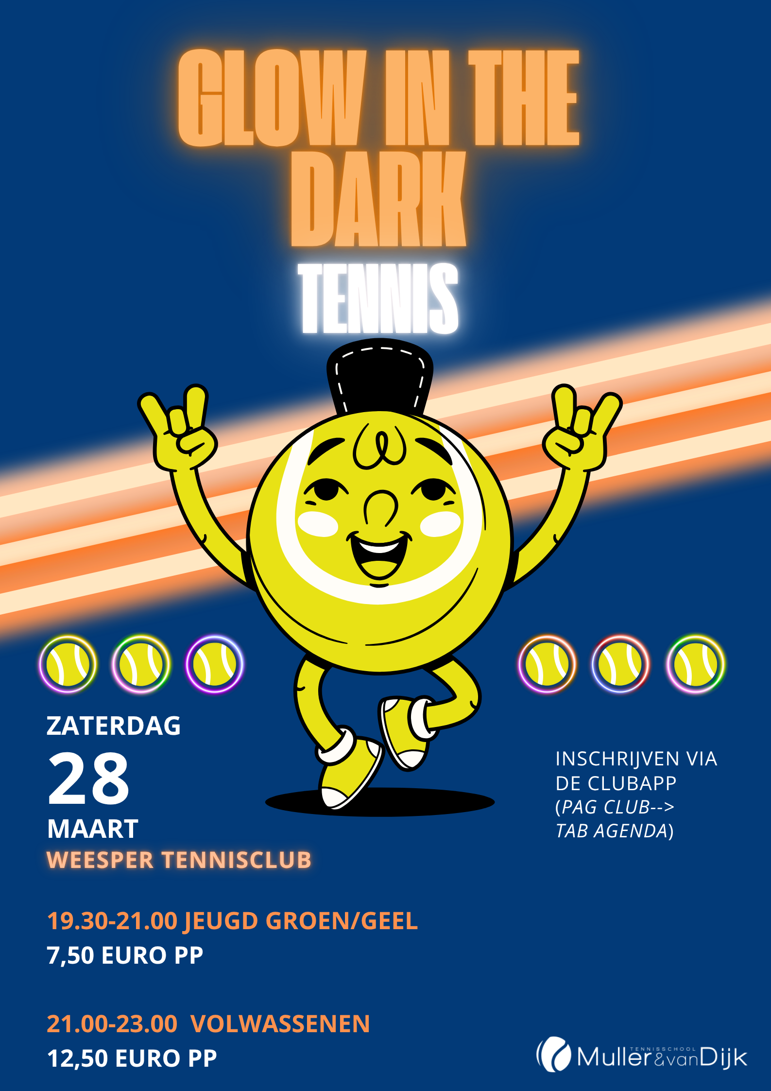 Tennisschool Muller&vanDijk en de Weesper Tennisclub organiseren gezamenlijk het Glow in the Dark tennis-evenement.